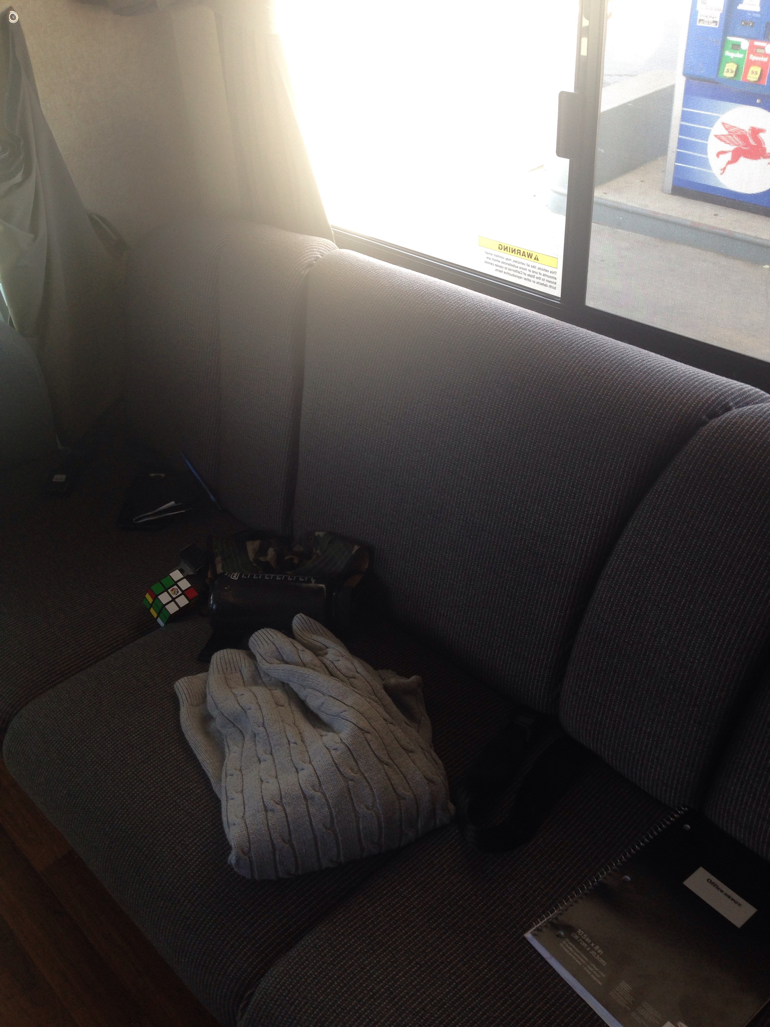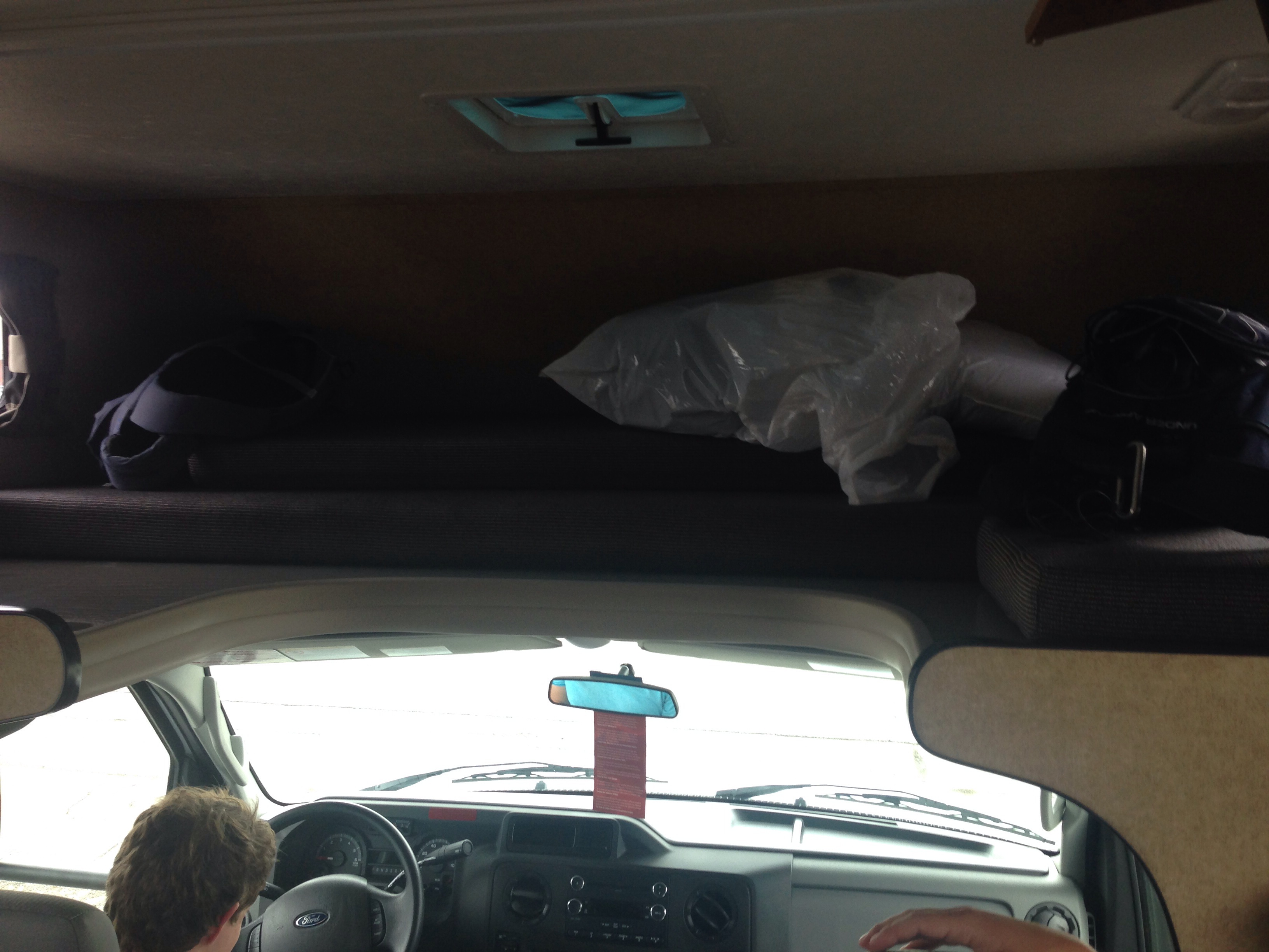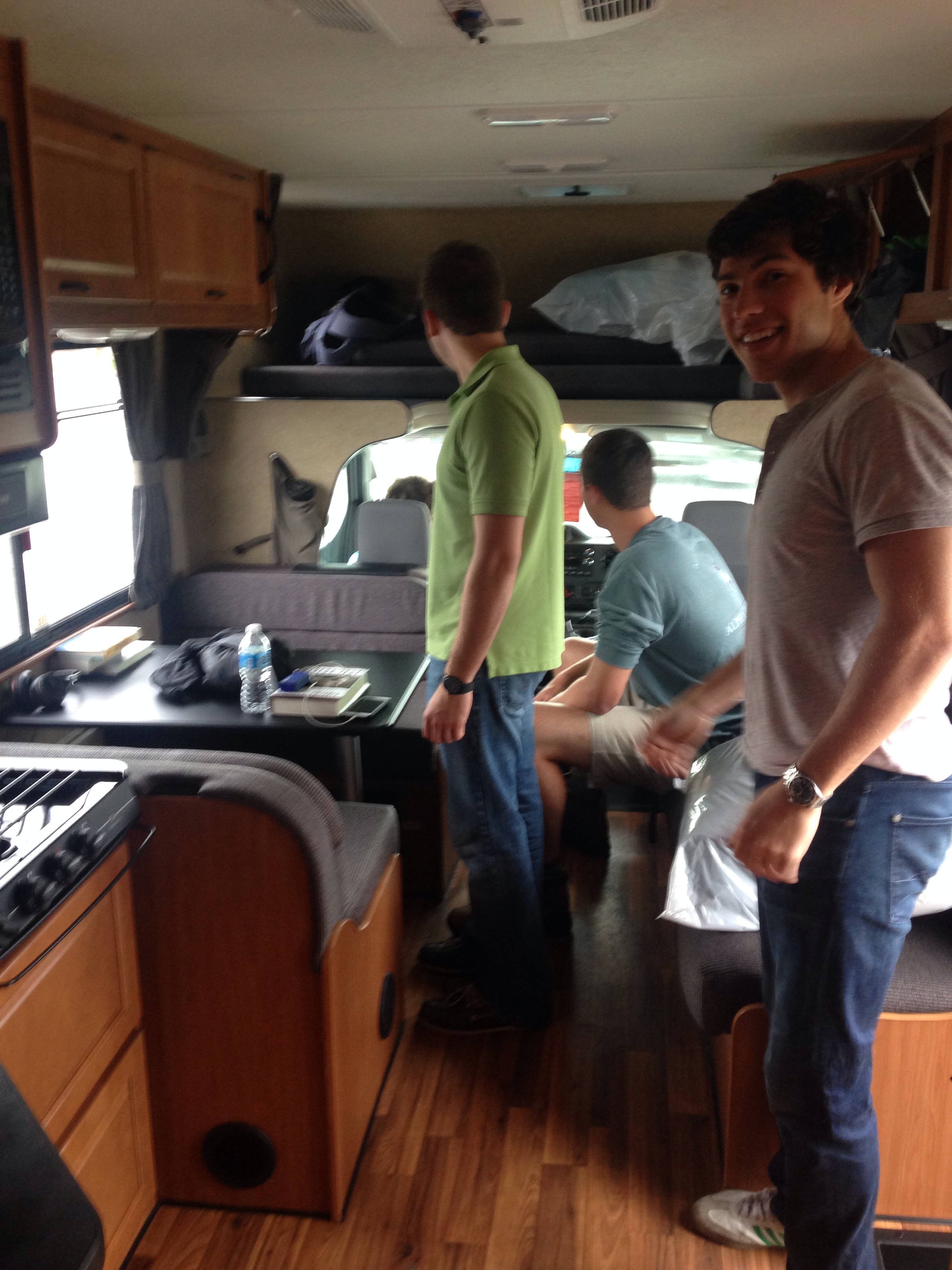 So, it seems we have a queen bed (a.k.a. the coffin) above the driver’s seat, a couch that miraculously converts into a full bed, a little dining set that even more miraculously converts into a twin bed, and finally the badass queen bedroom in the back. we also have a shower that we are essentially forbidden to use and a toilet that we are half-forbidden to use, if you catch my drift.